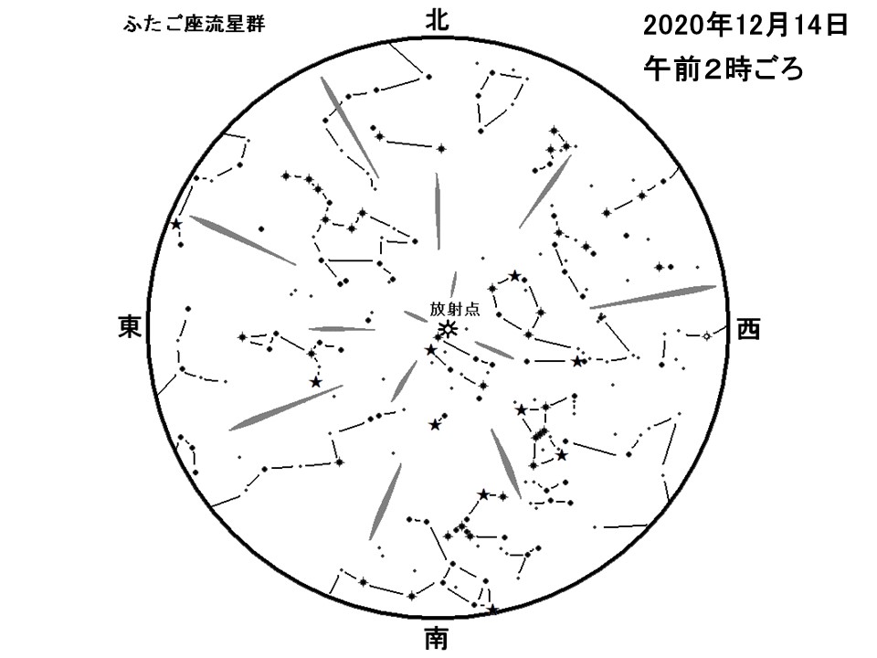今年のピーク時刻は14日の午前9時ごろと予想されます。昼間がピーク時刻となりますので、いちばんのピーク近くは14日の未明となります。しかしふたご座流星群は母天体である小惑星ファエトンが流星物質を出し切った後の天体(元彗星)と考えられており、すでに広範囲に流星物質が広がっていると考えられています。これは流星群が長い期間、鋭いピークがなく安定して見られることも意味しています。観測は13日夜から14日夜明け前が最良と考えられますが同様に14日夜から15日夜明け前も観察のチャンスです。