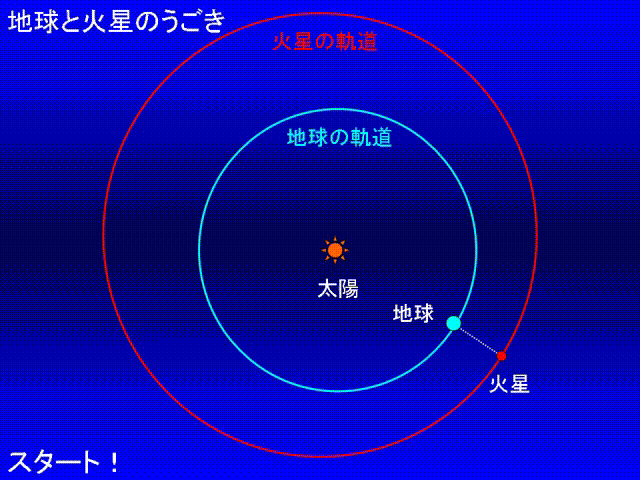 火星は地球と同じように太陽のまわりをまわる「惑星」です。そして地球の「お隣さん」すぐ外側をまわっています。地球は太陽のまわりをまわる「公転周期」は365日。1年ですね!火星の公転周期は687日です。この周期の違いで地球と火星の距離が大きく変わります。