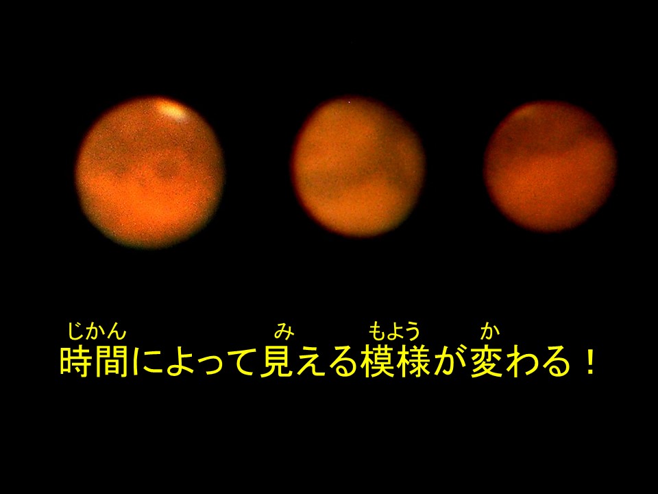 しかも自転周期が地球とほぼ同じ、でも少しずれていますから、毎日少しずつ見えるところが変わります!もちろん夕方と明け方では見える場所が違いますので観測しがいがあります。気象衛星のようにぐるっと火星を観測なんてできてしまします。「大きな望遠鏡が欲しい!」となってしまいますね・・・