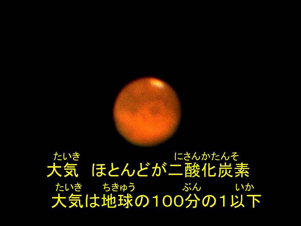 惑星自身が小さく、重力も小さいのも理由です。これでは窒息です・・・でもわずかな大気で嵐がおこったり砂が舞ったりして模様に変化が生じます。「大きな望遠鏡なら」火星の気象観測も可能なのです!