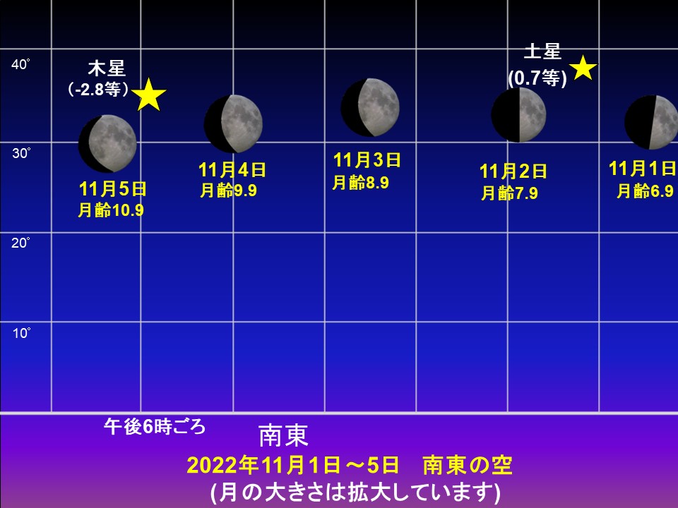 夕方の南東の空~深夜の西の空にかけて月と木星がならびます。月も木星もとても明るいのですばらしい眺めでしょう。