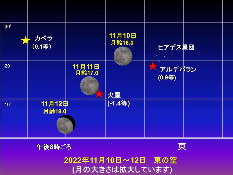 11月11日の午後8時ごろの東の空から未明の西の空にかけて月と火星がならびます。火星は12月1日に地球に最接近します。赤く明るく輝いています。月とのならびも美しいでしょう。