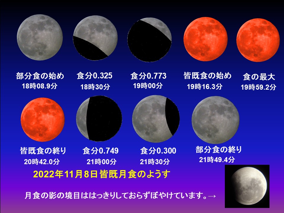 18時8.9分から部分月食が始まります。今回も見えるのが比較的早い時刻ですので観察しやすい月食です。皆既月食となるのは19時16.3分です。今回は皆既月食は1時間半ほど継続し、皆既月食が終わるのは20時42.0分です。半影月食をのぞくすべての月食が終わるのは、21時49.4分で午後10時までにはすべての月食を見ることができます。